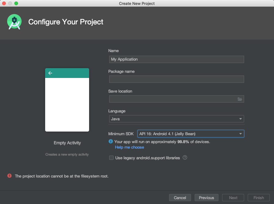 (5) Minimum SDK : SDK(Software Development Kit)는 안드로이드 버전으로 이해하면 쉽다. (정확히 SDK가 버전인 것은 아니지만)