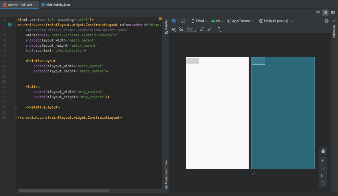 하지만 코드로 작성하는 것을 추천한다. 뷰 방식이 굉장히 직관적이고 편리하긴 하나 안드로이드 앱을 더 짜임새 있고 높은 퀄리티로 제작하기 위해선 코드의 이해과 공부가 필수적이다. 오른쪽 위 3개의 버튼을 통해 레이아웃 작성 방식을 변경할 수 있다.