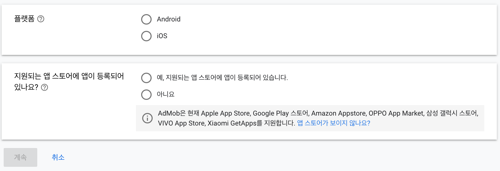 플랫폼과 앱 스토어 등록 여부를 체크 한 후 앱을 등록한다.