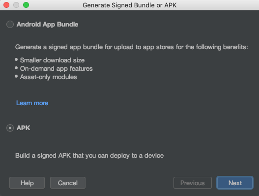 구글은 APK가 아닌 새로운 방식의 Android App Bundle을 사용해 앱 파일을 제작하길 권장한다. APK와 Android App bundle을 선택할 때도 Android App Bundle의 장점을 간략하게 어필한다.