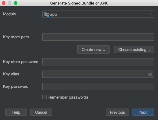 2. Android App Bundle (Next) > Create new... (키가 존재하면 키에 대한 정보 입력후 다음을 누르면 됩니다.)