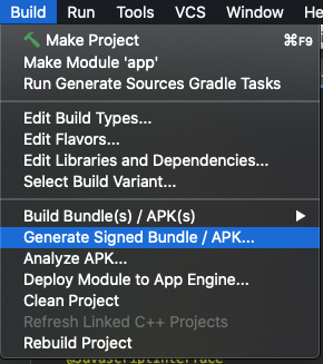 1. Build > Generate Signed Bundle / APK...